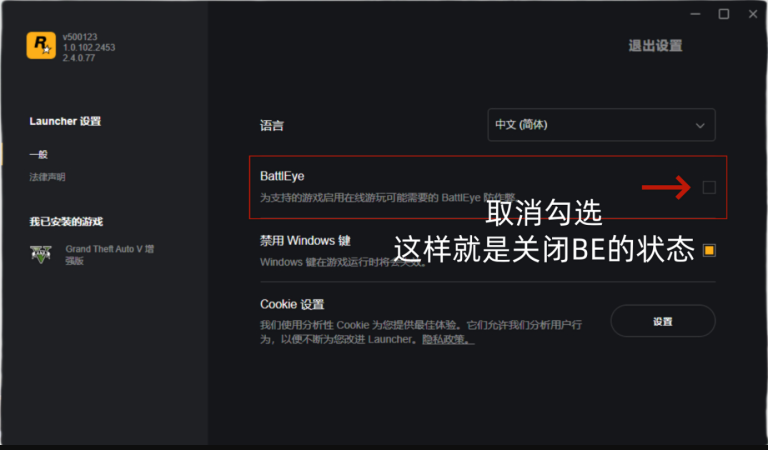 2、该菜单建议关闭BE反作弊 (打开并登录R星启动器 – 右上角设置 – 找到 BattlEye 并关闭BattlEye (默认黄色,代表开启,反之关闭))