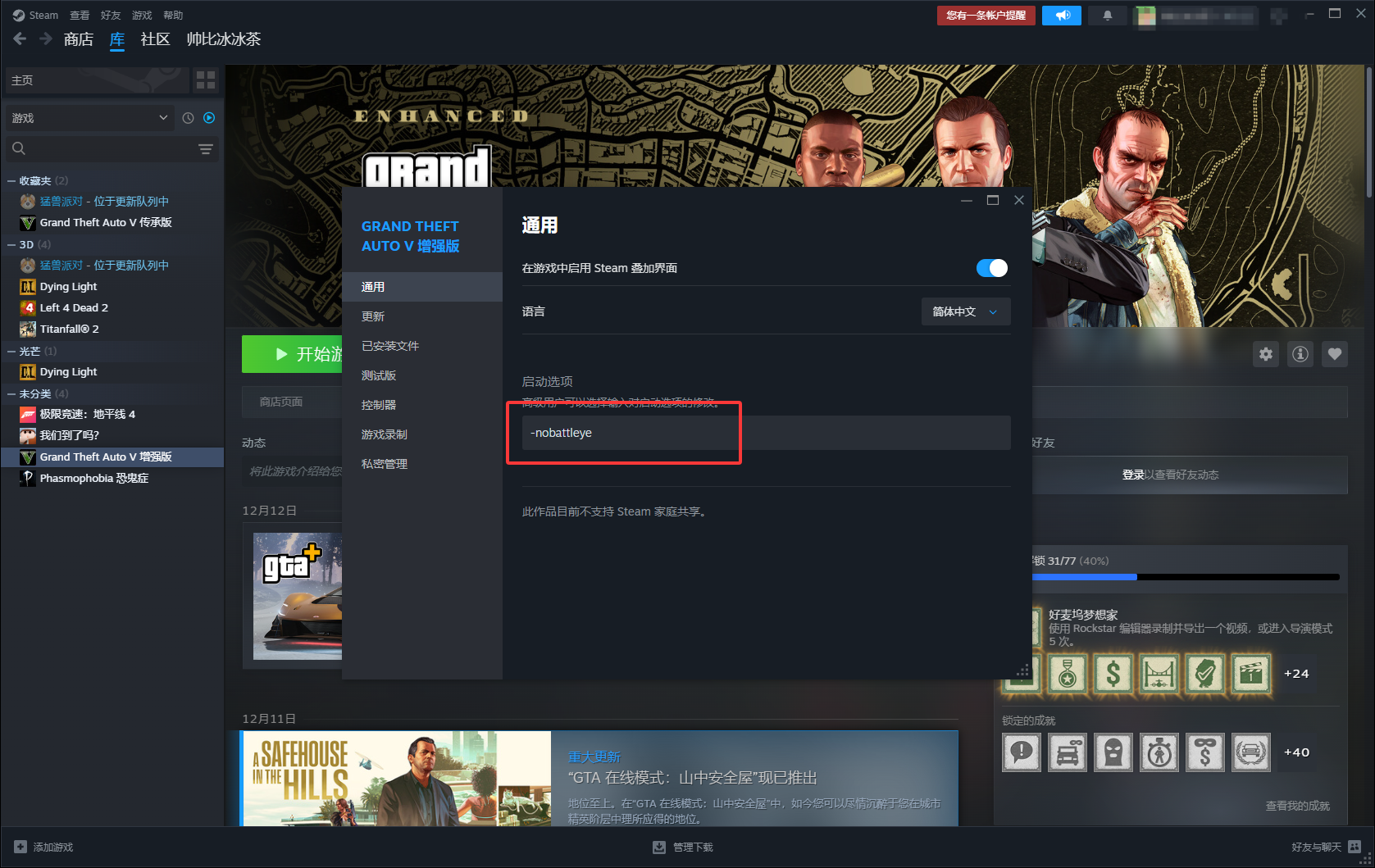 在steam中选GTAV属性里 添加-nobattleye